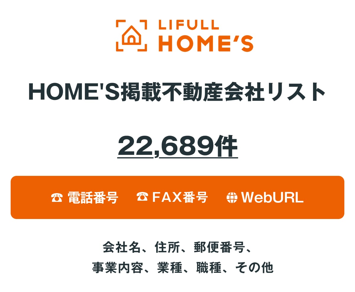 LIFULL HOME'S掲載不動産会社リスト【22,689件 ※電話番号、FAX番号、ホームページURL等を含む】