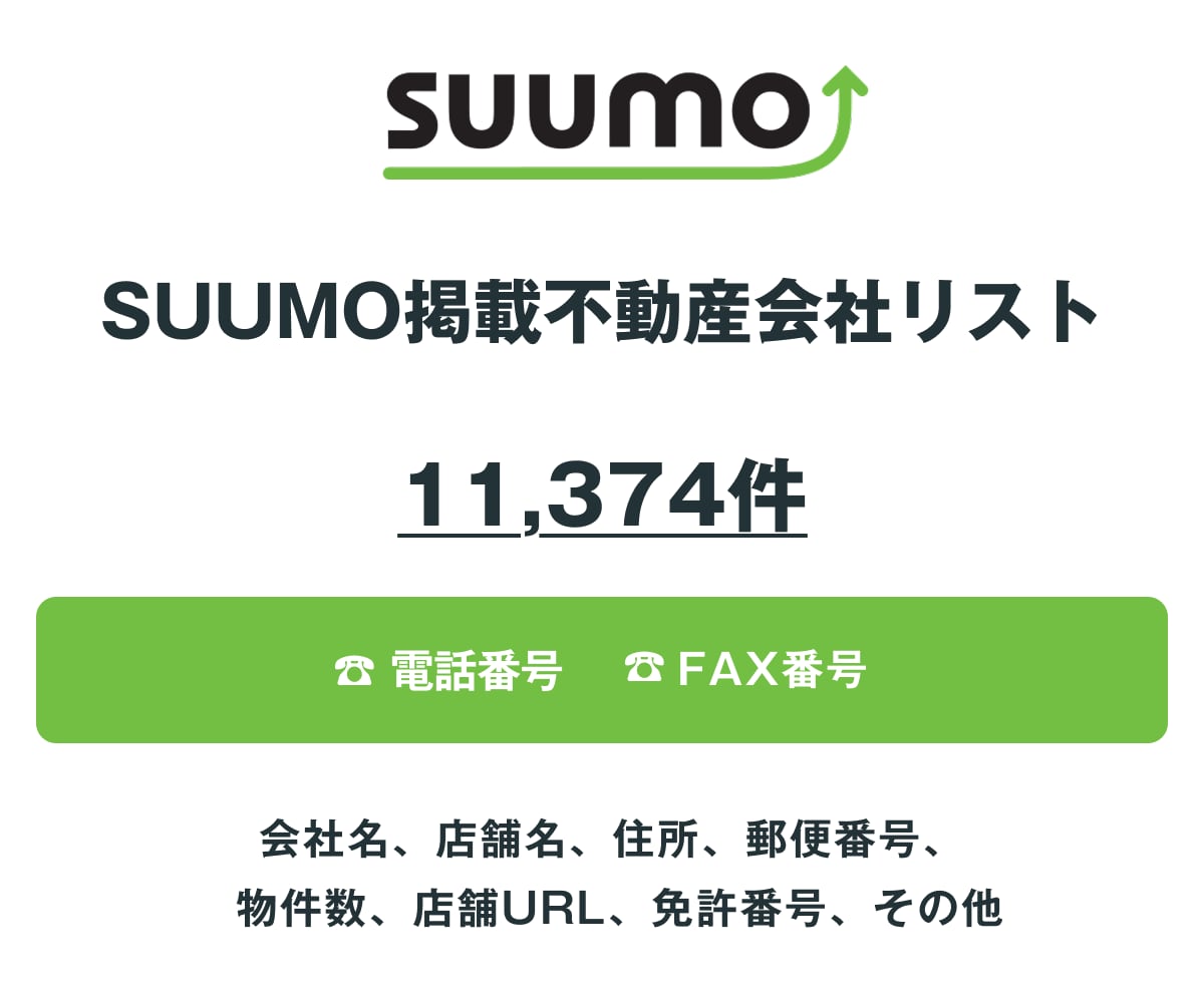 SUUMO掲載不動産会社リスト【11,374件 ※電話番号、FAX番号、ホームページURL等を含む】