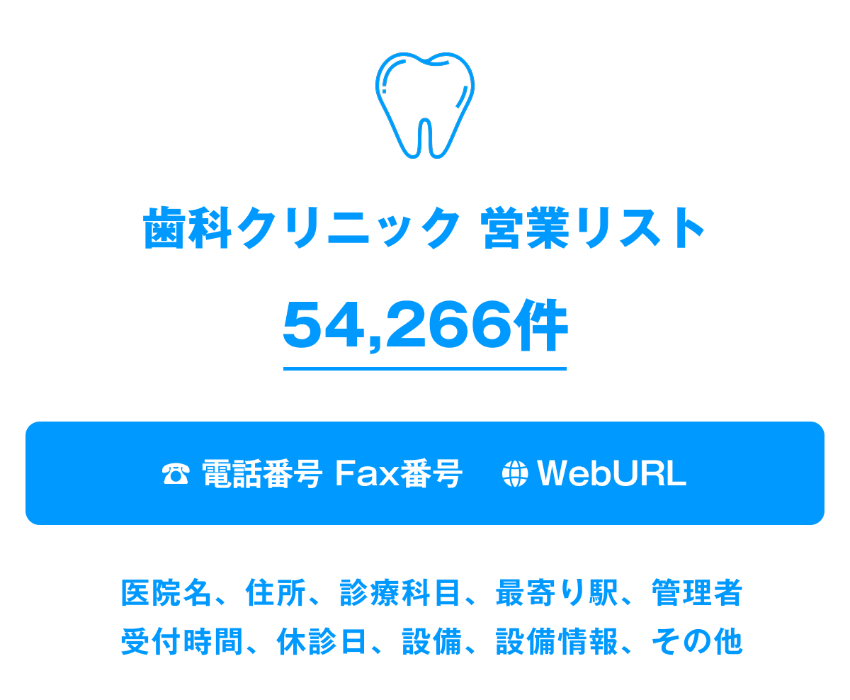 歯科クリニックのリスト【54,266件 ※電話番号、FAX番号、ホームページURL等を含む】